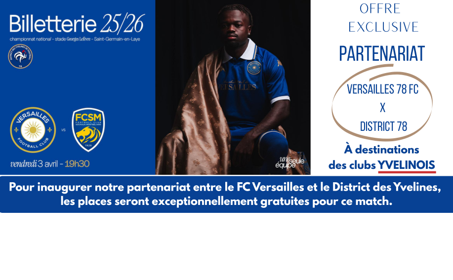 OFFRE EXCLUSIVE Partenariat VERSAILLES 78 FC x DISTRICT 78 ► Pour inaugurer notre partenariat entre le FC Versailles et le district des Yvelines, les places seront exceptionnellement gratuites pour ce...